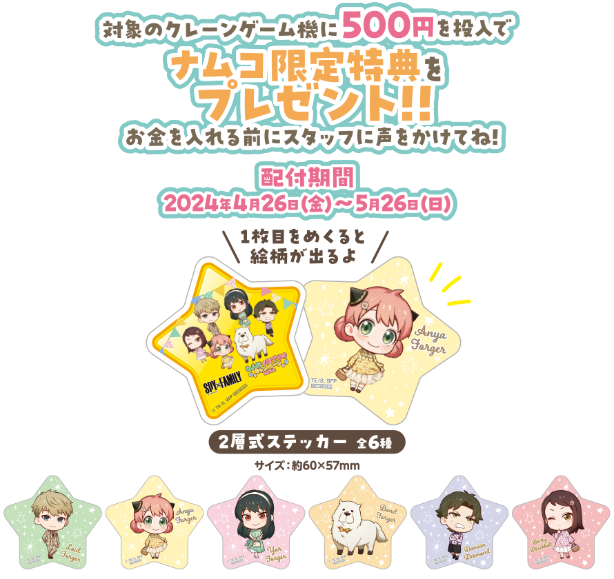 SPY×FAMILY SPY×FAMILY(プライズ) 【2024年5月26日まで】SPY×FAMILY × ナムコ 「みんなでおでけけキャンペーンinナムコ」 PR 2024年5月10日 2024年5月10日 Facebook postはてブLINEPocketFeedly 全国のナムコとナムコオンラインクレーンにて、SPY×FAMILYとのコラボキャンペーンを実施中! ★ナムコ限定プライズや限定特典が登場中です! 登場プライズ ナムコ限定特典 ▼関連ページ キャンペーン特設ページナムコオンラインクレーンSPY×FAMILY2024年4月プライズまとめ Facebook postはてブLINEPocketFeedly