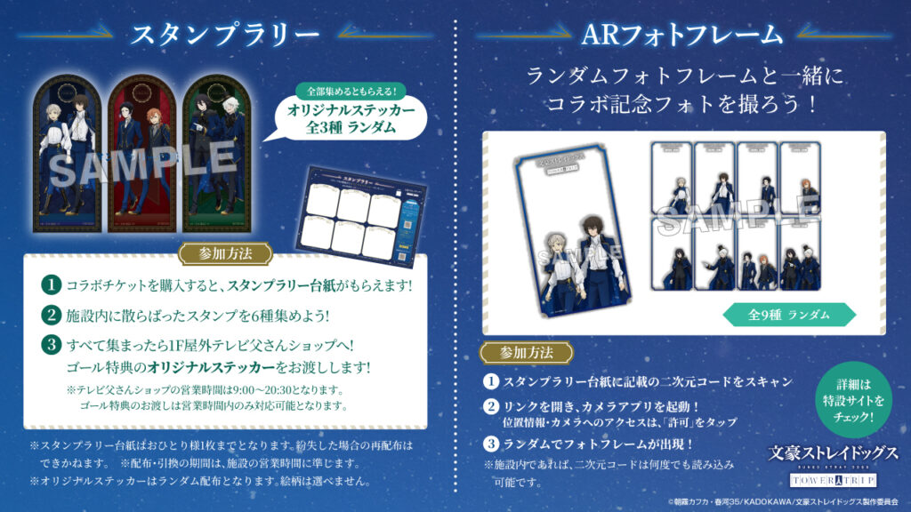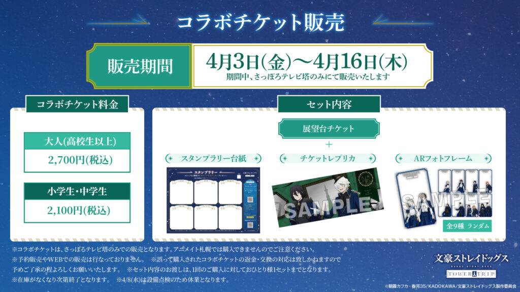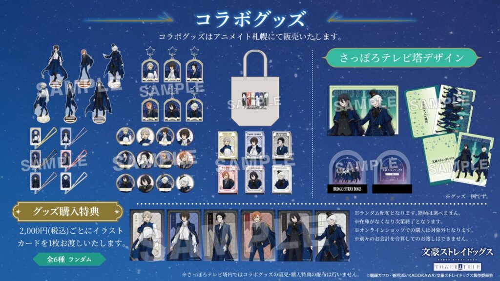 文豪ストレイドッグス 文豪ストレイドッグス TOWER TRIP in さっぽろテレビ塔 PR 2026年4月3日 2026年4月3日 Facebook postはてブLINEPocketFeedly 【開催期間】2026年4月3日(金)~4月16日(木)※4月8日(水)は設備点検のため休業 【物販会場】■アニメイト札幌■GK Store(通販) グッズ通販はこちらイベント詳細はこちら GK Storeでは極楽湯グッズも販売中! 商品ページはこちら Facebook postはてブLINEPocketFeedly